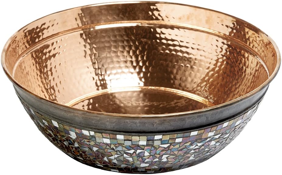 The new bardeen vessel sink by Sinkology is function yet beautiful. Handmade by highly skilled artists each copper sink in unique. Featuring hand applied mosaic glass the bardeen copper vessel will make a dramatic statement in your bathroom. Naked copper interior is unfinished and will naturally patina with time and use, it is easy to polish back to the original shine. Artfully crafted from 18 gauge Pure solid copper. This work of art is protected by a lifetime warranty and designed to be a focal point of pride in your home.
